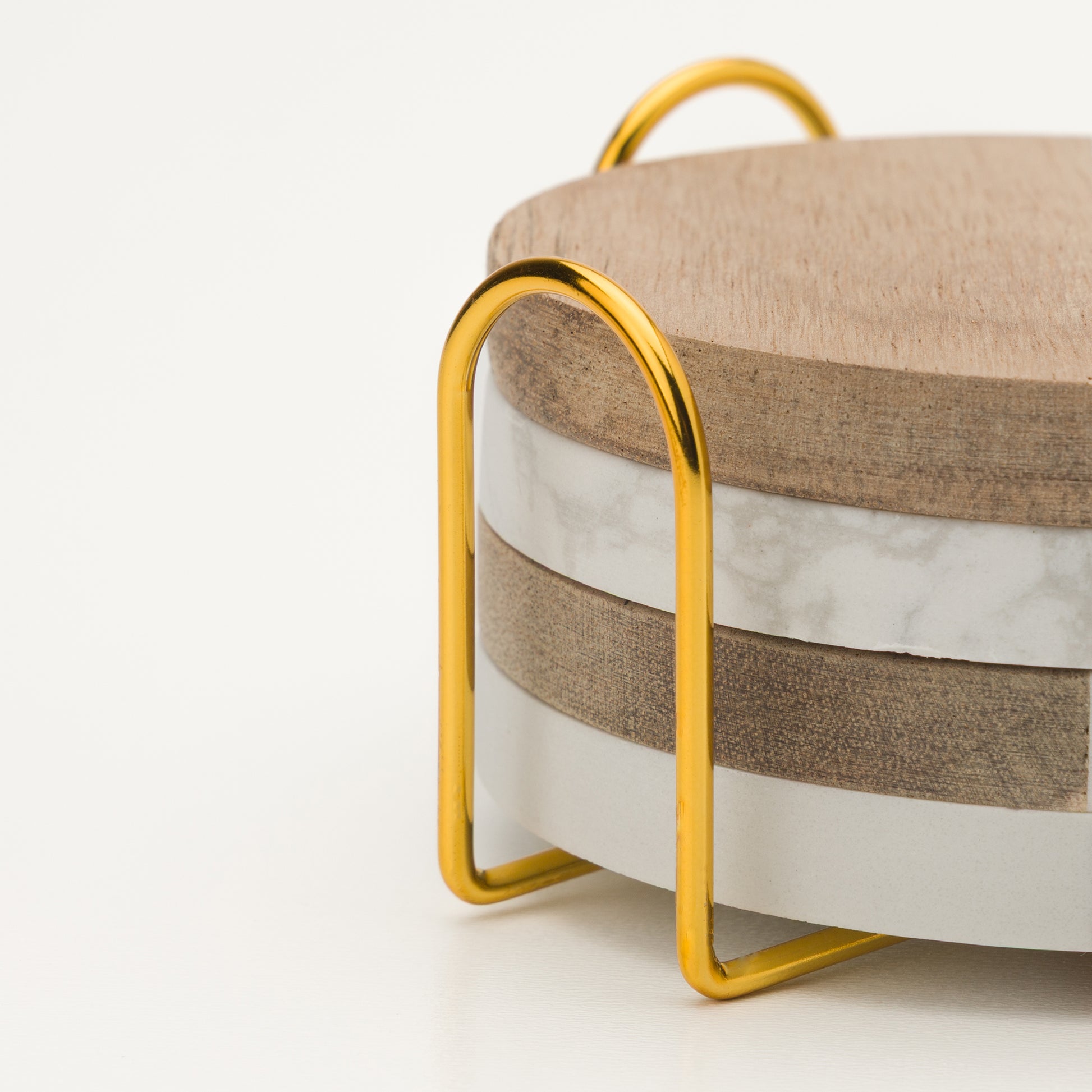 Позлатената метална стойка допълва комплекта, като подрежда подложките красиво и ги превръща в декоративен акцент върху масата, плота или рафта.