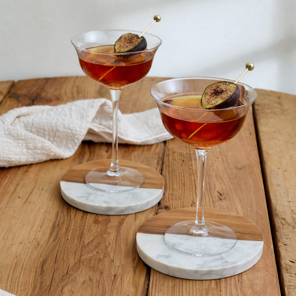 Елегантен подаръчен комплект подложки от дърво и мрамор, подредени в изискана позлатена метална стойка.