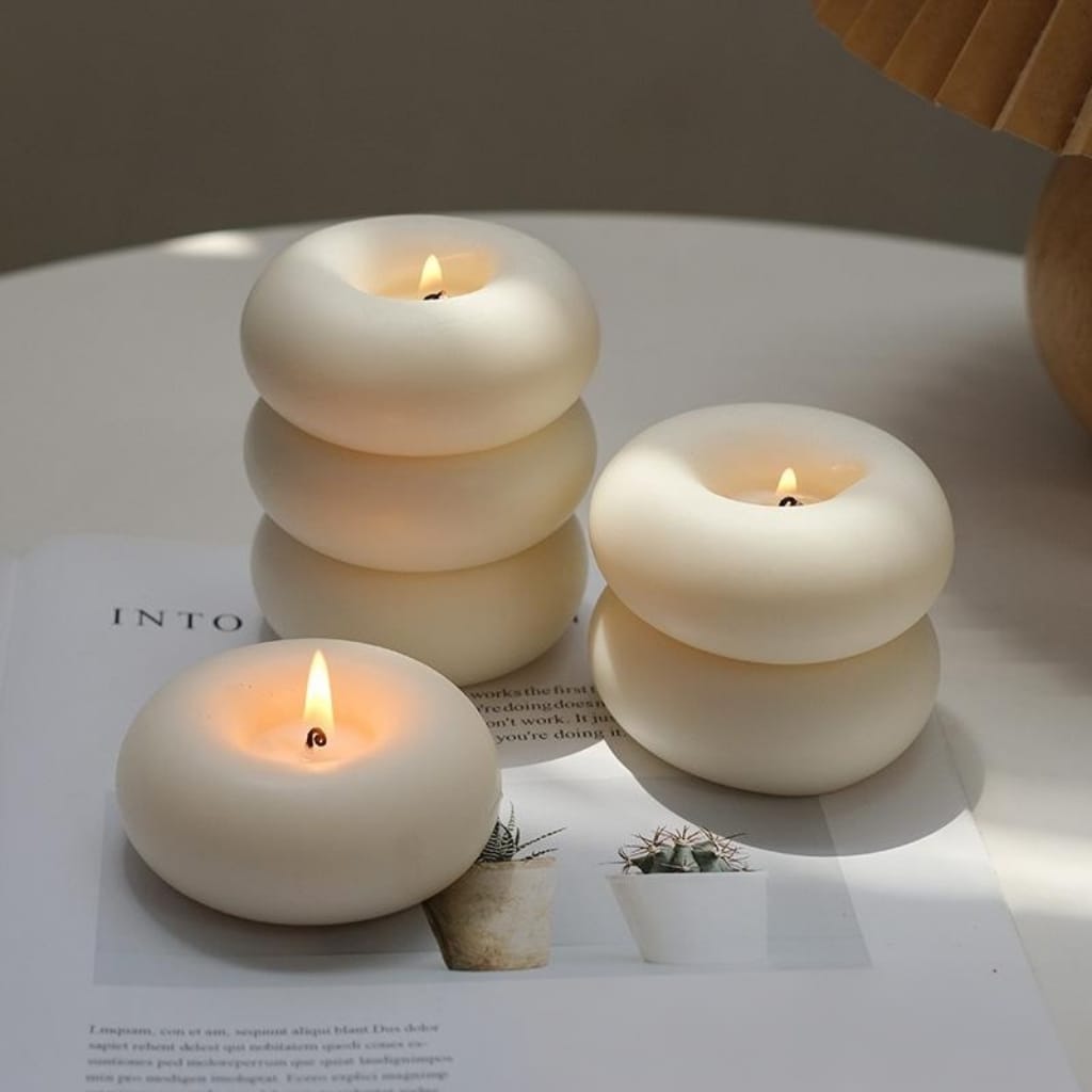 Скулптурна свещ с форма на пръстен. Мека светлина, гладка повърхност и спокоен аромат. Подходяща за дом, подарък или празник.