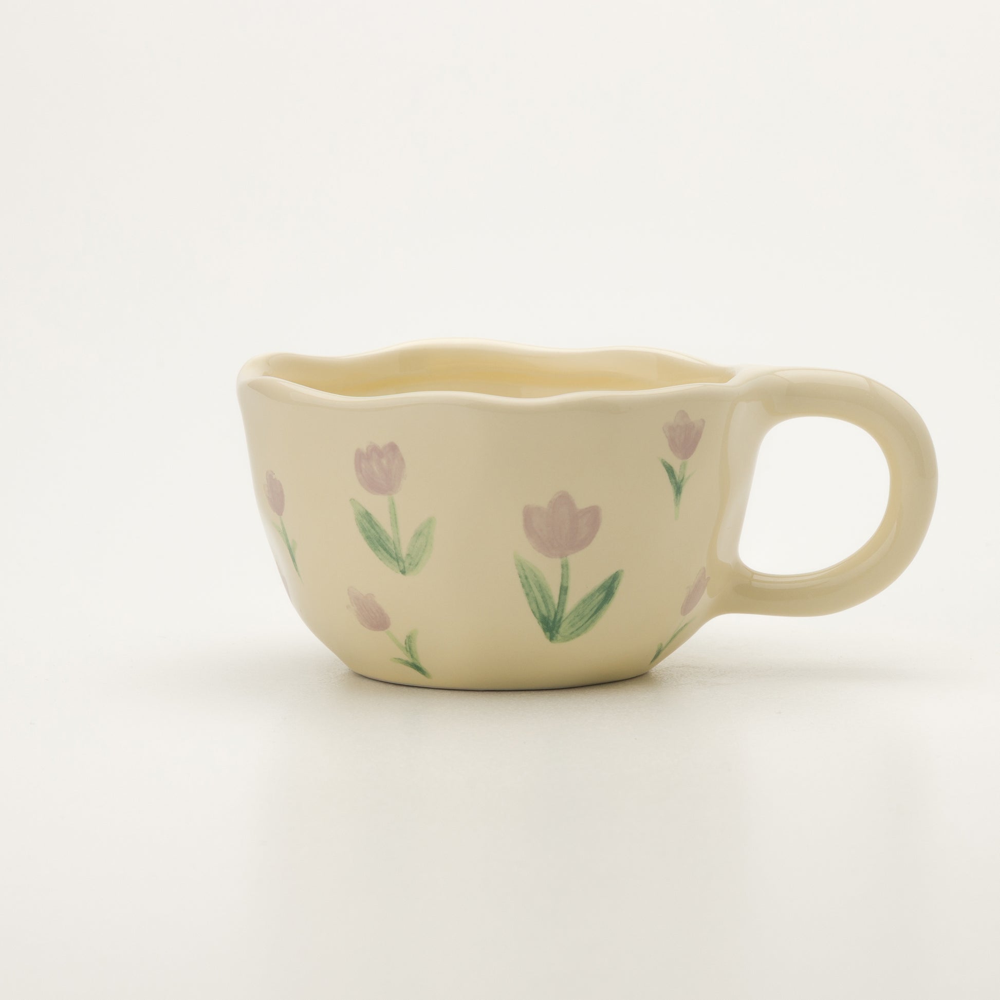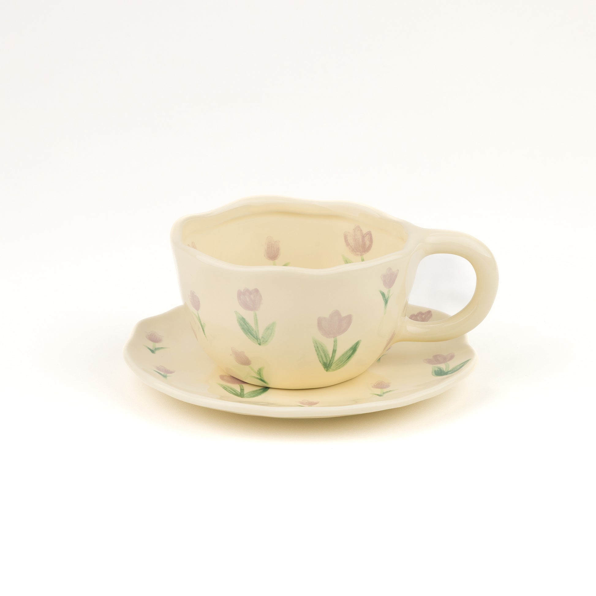 Очарователен комплект чаша и чинийка, ръчно рисувани с нежни лалета в меки пастелни цветове. Формата е леко неправилна, което подчертава артистичния характер на комплекта и носи усещане за уют и топлина.