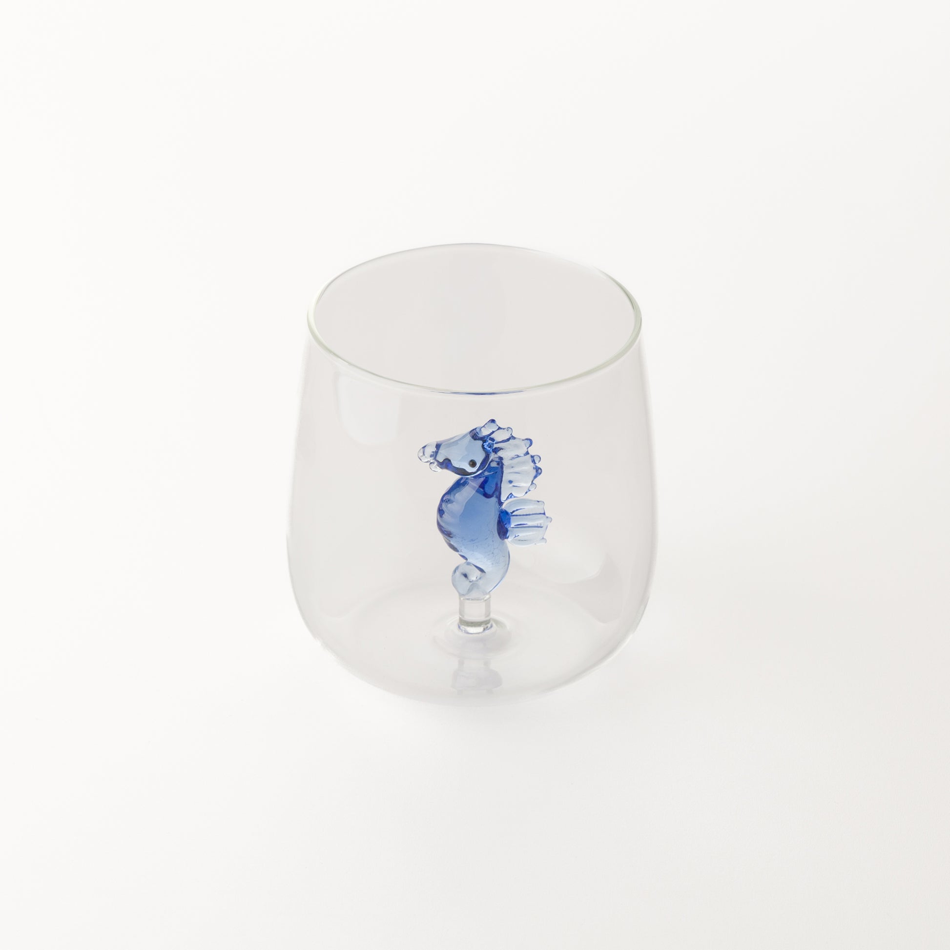 Елегантна стъклена чаша с ръчно изработена триизмерна фигурка на морско конче във вътрешността.