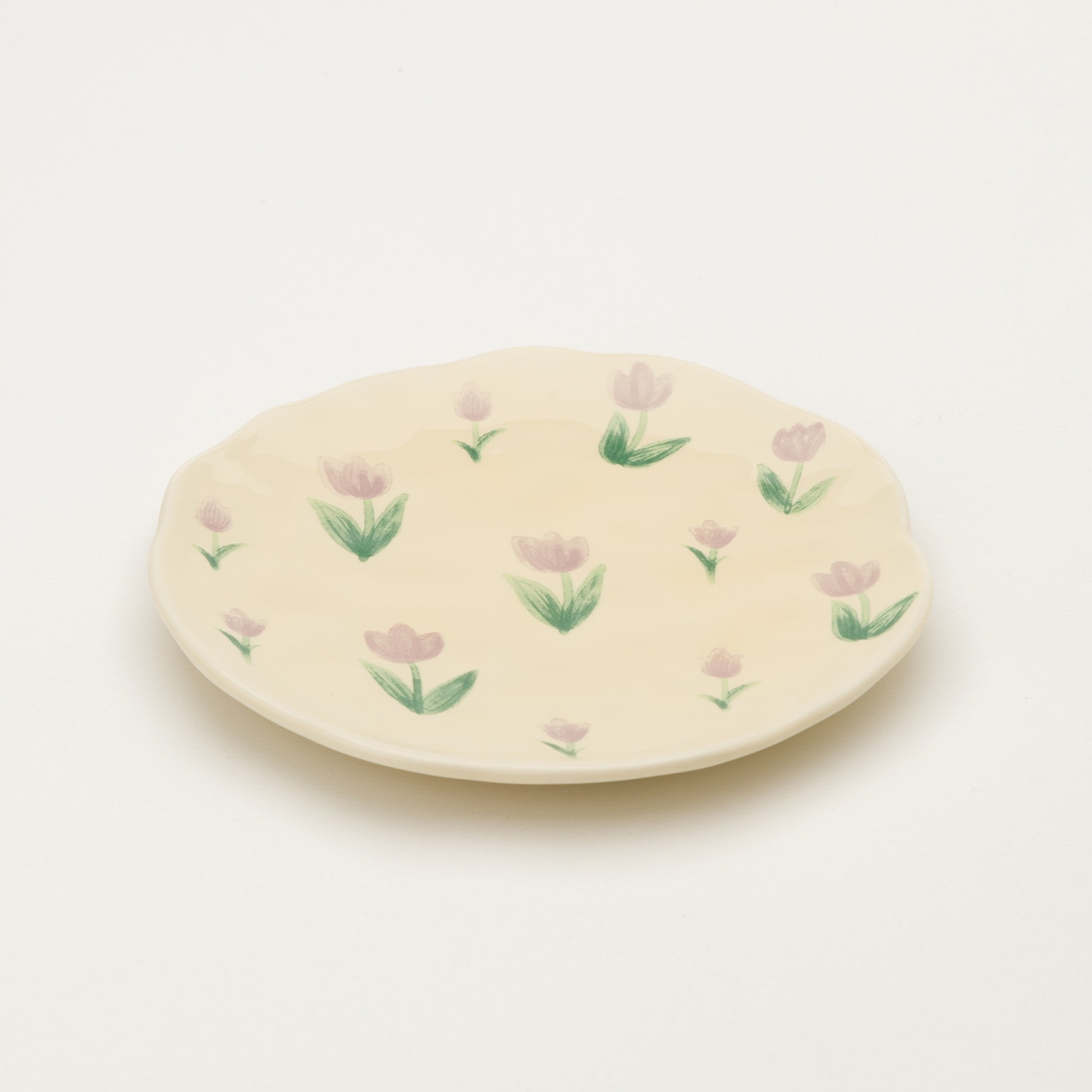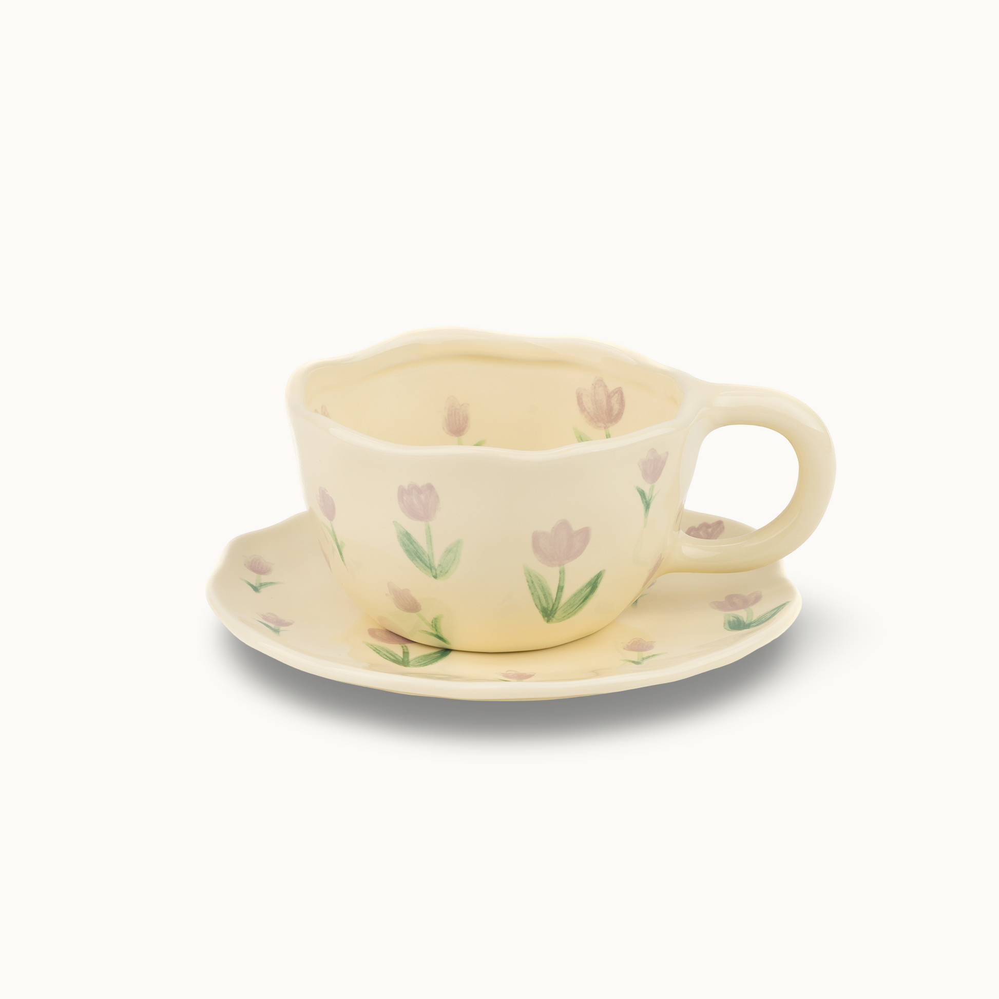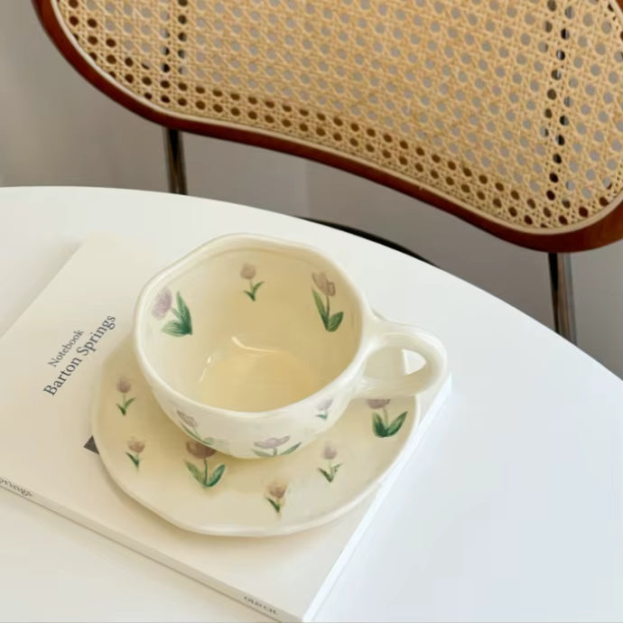 Очарователен комплект чаша и чинийка, ръчно рисувани с нежни лалета в меки пастелни цветове. Формата е леко неправилна, което подчертава артистичния характер на комплекта и носи усещане за уют и топлина.