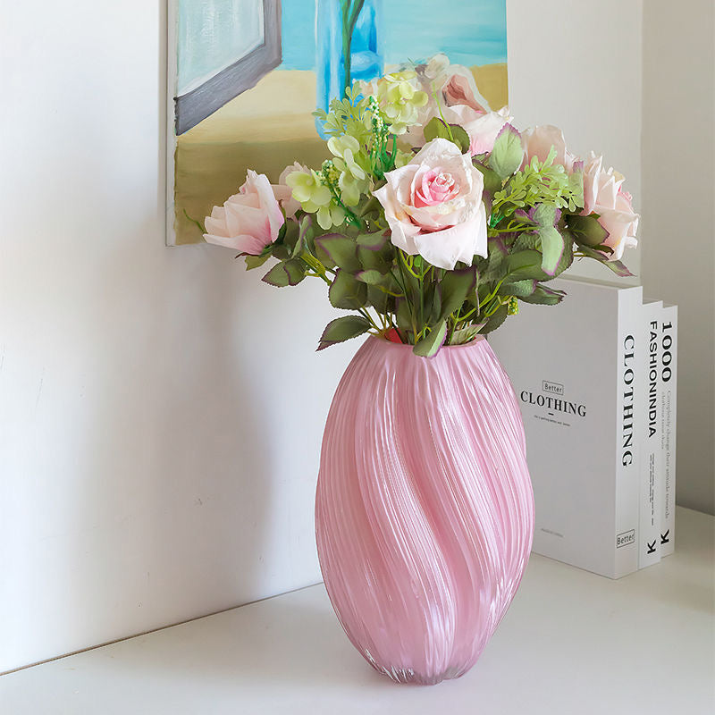 Керамична ваза с мека вълнообразна текстура и лек, ефирен цвят. Формата е заоблена и елегантна, а декоративните линии създават усещане за движение и светлина. Подходяща е за рафт, масичка или като централен акцент върху поднос.