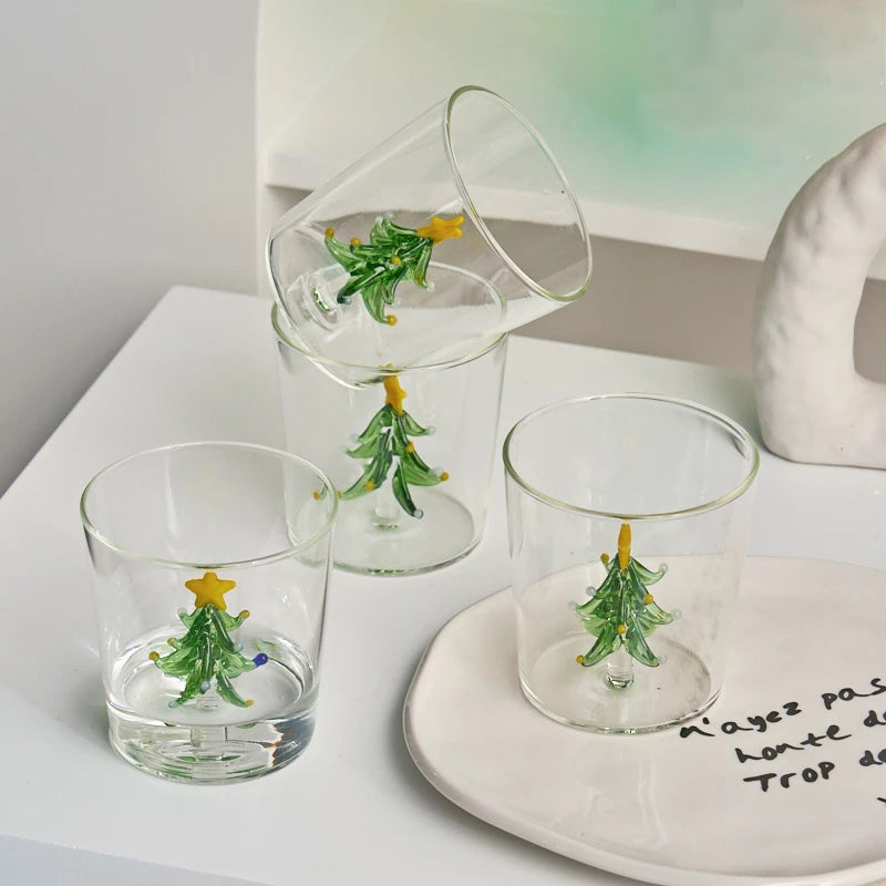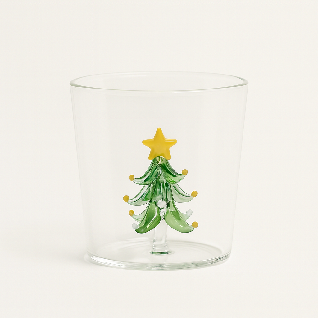 Очарователна стъклена чаша с ръчно оформена фигурка на коледно дръвче, поставена във вътрешността. Този празничен дизайн създава уют и настроение – идеална за горещи напитки през зимата, както и като красив акцент в дома.