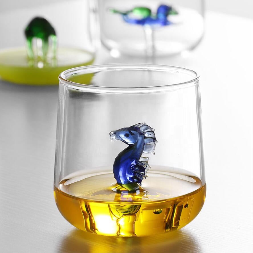 Елегантна стъклена чаша с ръчно изработена триизмерна фигурка на морско конче във вътрешността.