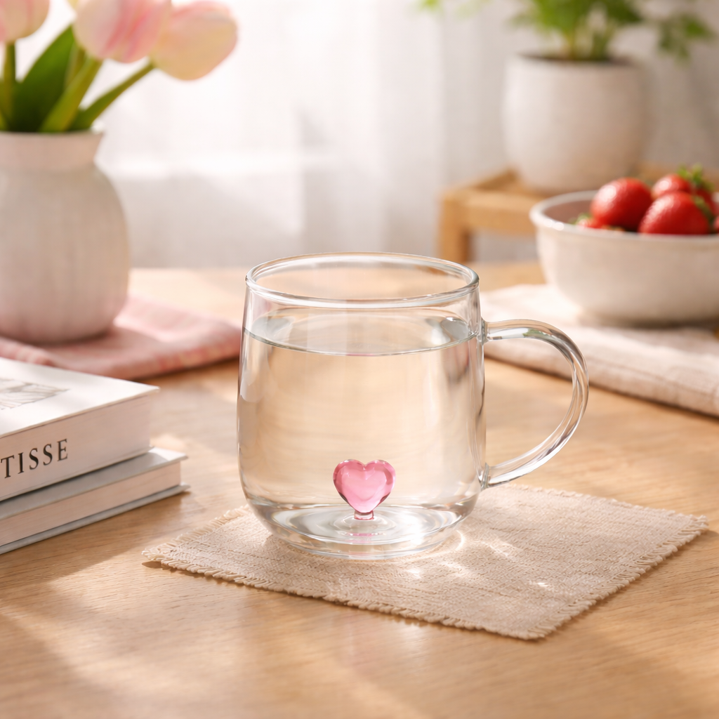 Очарователна стъклена чаша с прозрачно тяло и малко розово сърце в основата – нежна, модерна и перфектна за ежедневна употреба. Фината форма и изчистеният дизайн я правят подходяща както за кафе и чай, така и за мляко, лимонада и десертни напитки. Удобната дръжка осигурява стабилен захват, а дебелото боросиликатно стъкло е устойчиво на температурни разлики.