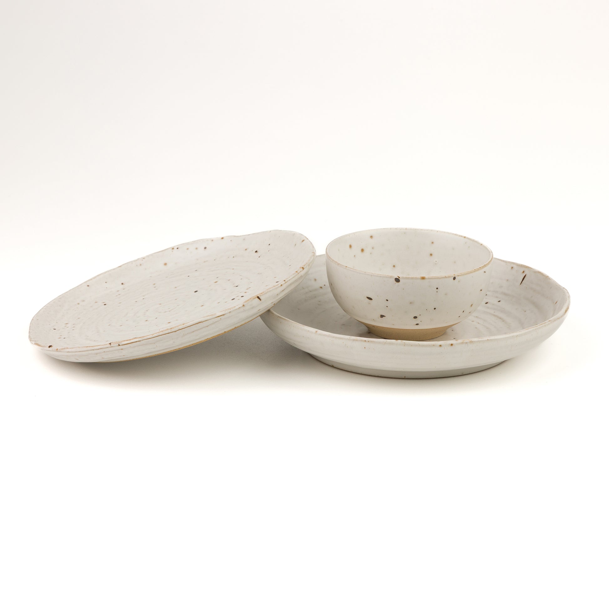 Керамичен комплект в мек натурален цвят с деликатни точици и ръчно изработен ефект.